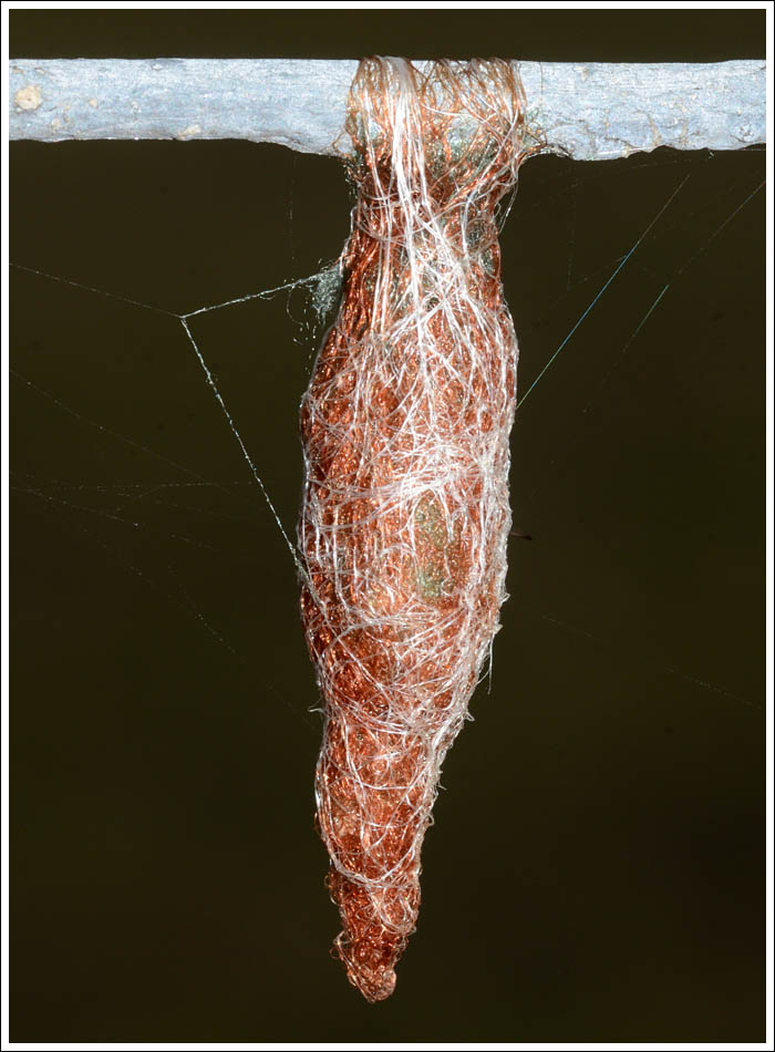 The egg sacs of the Christmas Jewel Spider, Austracantha minax are usually bound to vegetation, but occasionally can be found dangling, like this one found hanging from the top fence wire.